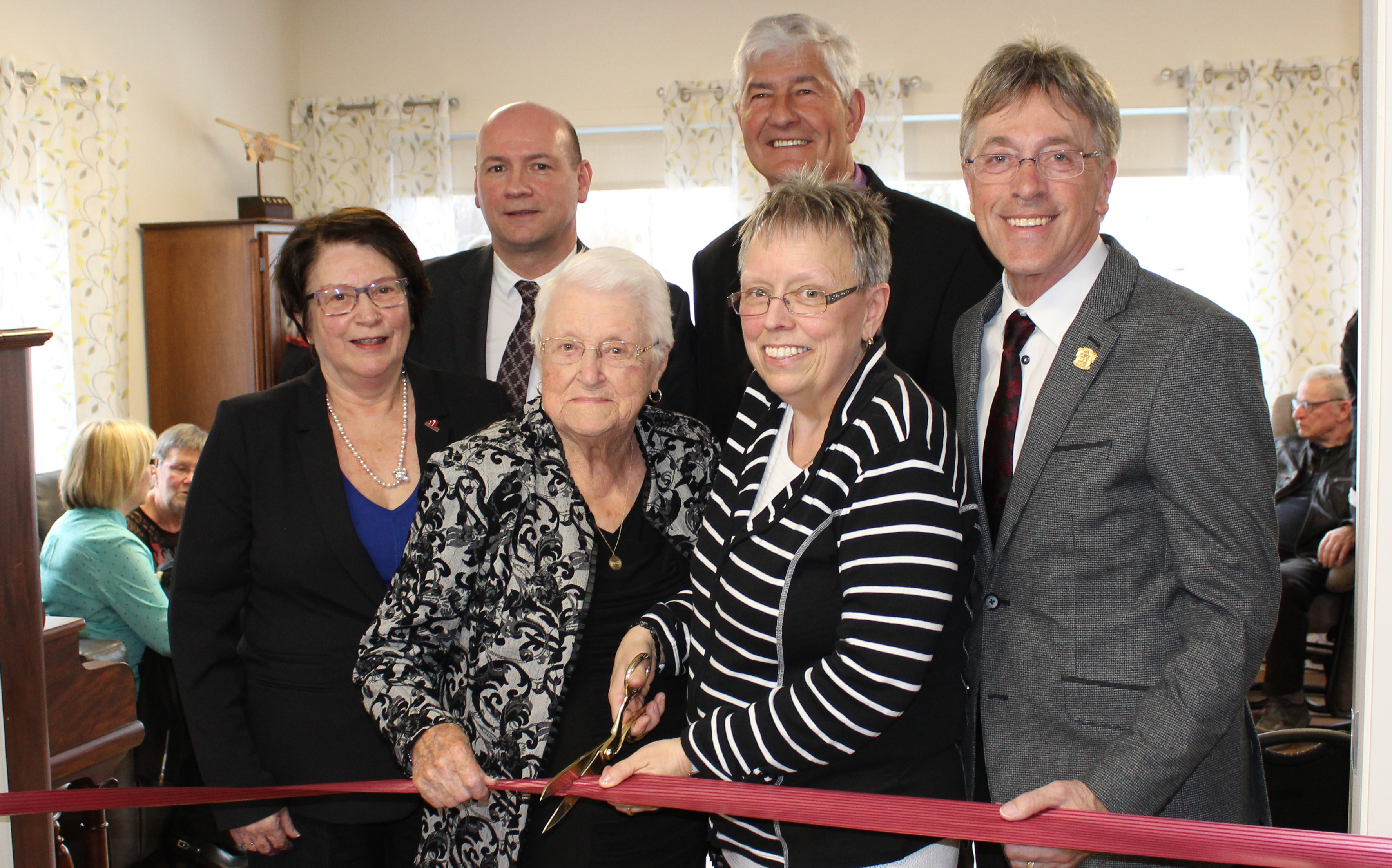Photo: Mmes Thérèse Duval Caron, la mère d'Hélène, et Hélène Caron, entourées de la préfet de la MRC de Montmagny, Mme Jocelyne Caron, de M. Christian Picard, représentant de la députée-ministre de Côte-du-Sud Marie-Eve Proulx, de M. René Laverdière, préfet de la MRC de L'Islet, et de M. Rémy Langevin, maire de la Ville de Montmagny.