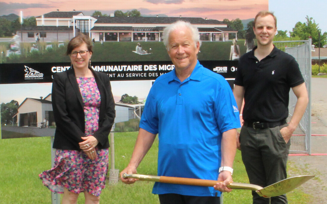La pelletée de terre officielle lançant les travaux de rénovation et d'agrandissement du centre communautaire des Migrations a été donnée aujourd'hui par le maire de Montmagny, M. Bernard Boulet, en présence en présence de la députée de Côte-du-Sud, Mme Marie-Eve Proulx, et du chargé de projet chez Construction Marcel Charest et Fils, M. Philippe Charest.