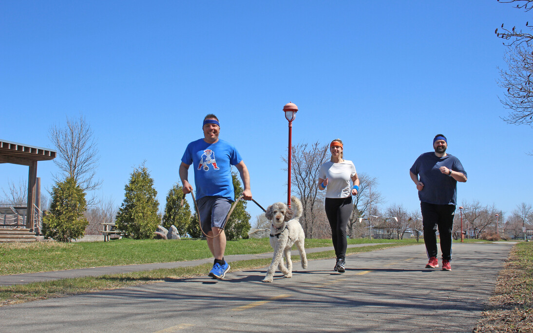 Photo : Les responsables mettent les bouchées doubles en prévision du 100 km du 375e du 11 juin! On aperçoit sur la photo (de gauche à droite) Jean-François Roy, coordonnateur du comité des Fêtes du 375e, en compagnie de son chien Rosie, ainsi que Lydia Bonin et Mathieu Sirois, respectivement chargée de projet et agent de développement à la SDÉ de Montmagny.