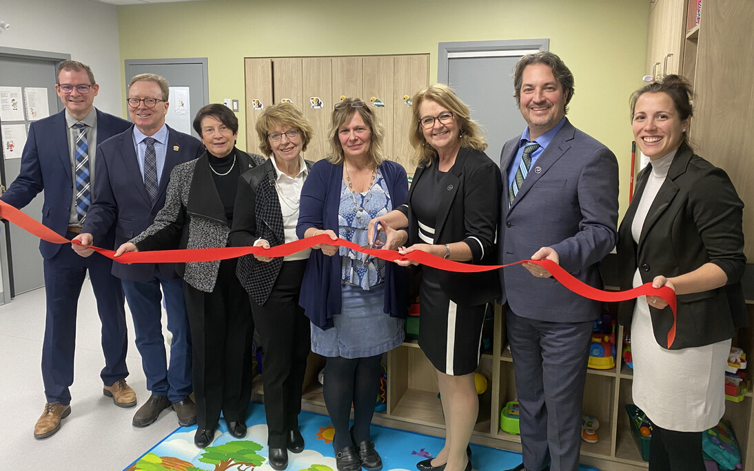 À la coupure du ruban, on aperçoit le PDG du CISSS de Chaudière-Appalaches, M. Patrick Simard, le maire de Montmagny, M. Marc Laurin, la préfet de la MRC de Montmagny, Mme Jocelyne Caron, la conjointe de feu Rémy Langevin, Mme Gisèle D'Anjou, la directrice générale du CPE, Mme Diane Caron, la ministre de la Famille, Mme Suzanne Roy, le député de Côte-du-Sud, M. Mathieu Rivest, et la présidente du CPE, Mme Vanessa Bouffard.