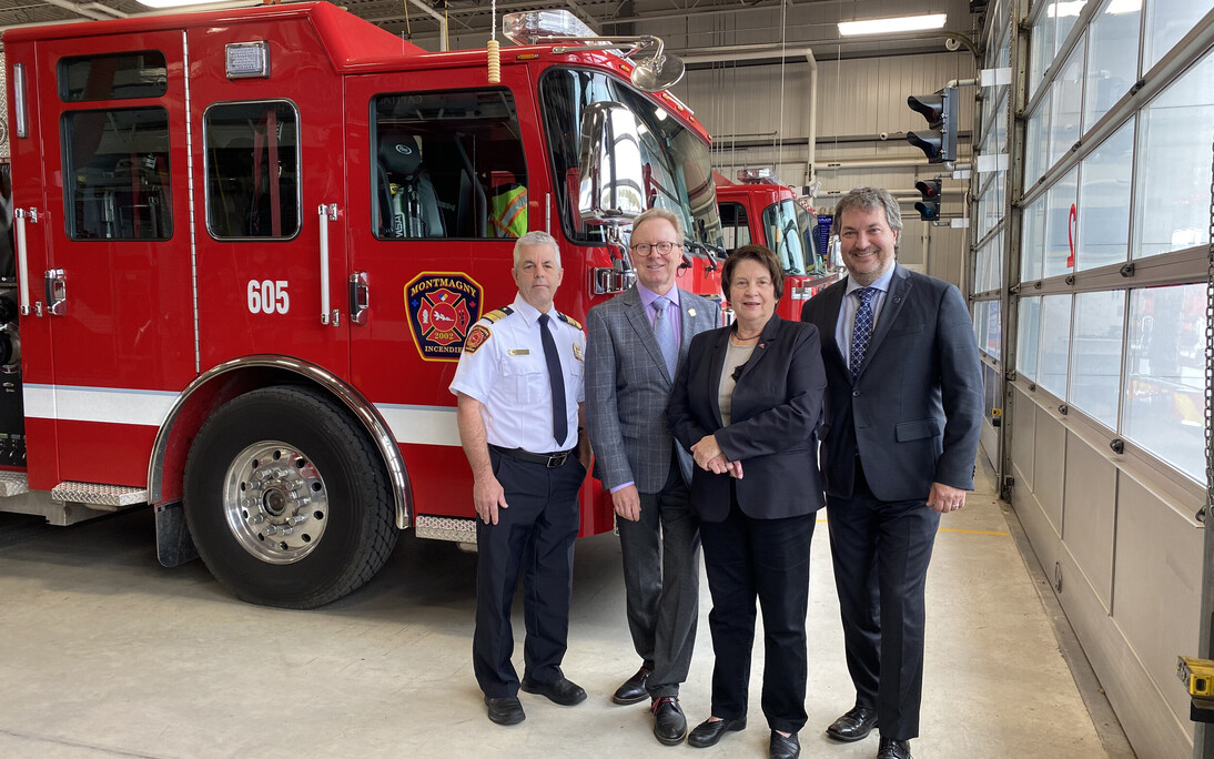 Sur la photo, on aperçoit (de gauche à droite) M. Pierre Boucher, directeur du Service de la sécurité incendie et de la sécurité civile de la Ville de Montmagny, M. Marc Laurin, maire de la Ville de Montmagny, Mme Jocelyne Caron, préfet de la MRC de Montmagny, et M. Mathieu Rivest, député de Côte-du-Sud.