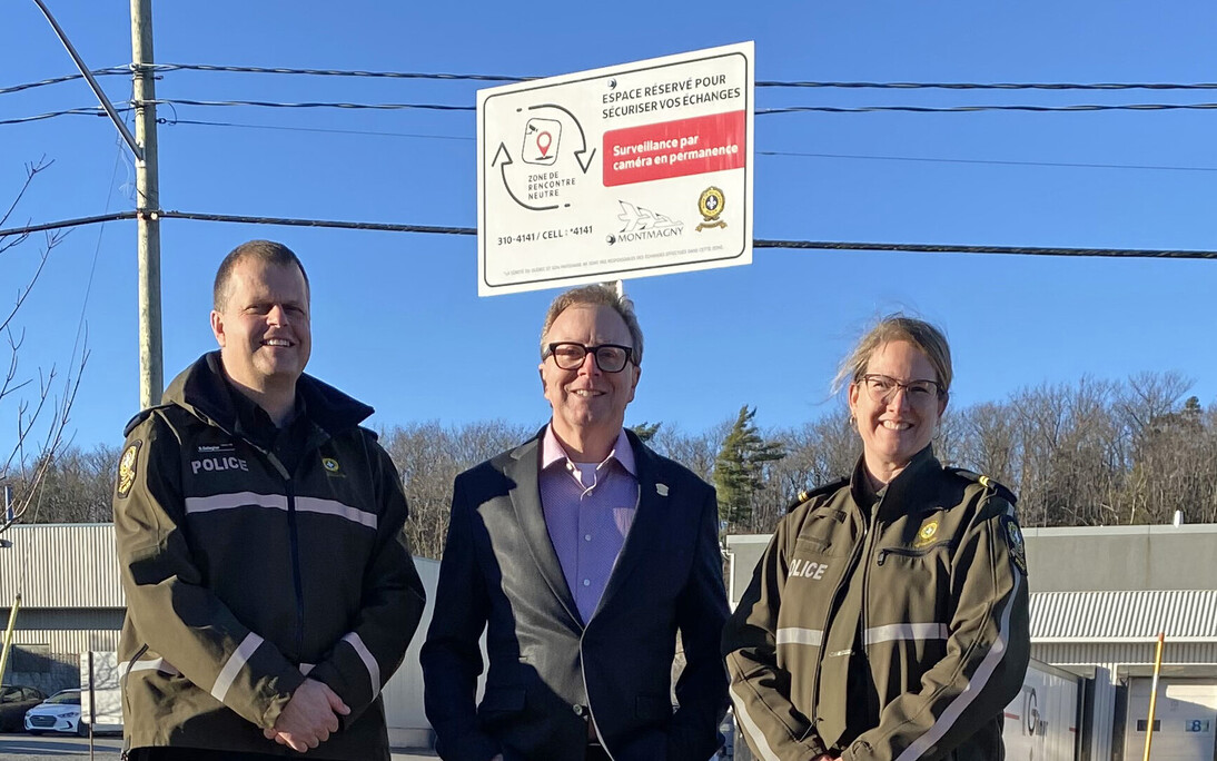 Sur la photo prise à la nouvelle Zone de rencontre neutre magnymontoise, on aperçoit le maire de Montmagny, Marc Laurin, entouré du sergent Benoit Gallagher, responsable du poste de la MRC de Montmagny pour la SQ, et de la sergente Mélanie Côté, coordinatrice locale en police communautaire.