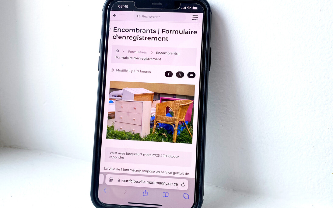 Les citoyen(ne)s de Montmagny peuvent dorénavant enregistrer facilement les encombrants qu'ils souhaitent faire ramasser grâce à un formulaire en ligne. Il suffit de consulter le ville.montmagny.qc.ca/encombrant pour y accéder et obtenir toutes les informations concernant le service de collecte des encombrants.