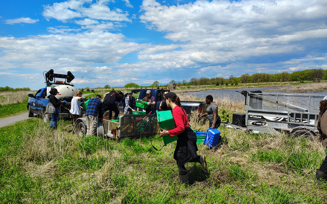 Parmi les nombreux aménagements réalisés en 2022 et 2023 au parc du Marais de Montmagny, trois sites de ponte pour les tortues ont été implantés en bordure du plan d'eau afin d'éviter qu'elles ne pondent leurs oeufs dans les sols malléables des jardins communautaires. Pour assurer l'efficacité de ces aménagements, les étudiant(e)s à la maîtrise en biogéosciences de l'environnement à l'Université Laval, accompagnés de Danielle Cloutier, chargée d'enseignement et responsable du programme, et de Jérémie Caron, biologiste et Magnymontois grandement impliqué dans la préservation de cet écosystème, sont venus faire leur entretien le 26 mai dernier.