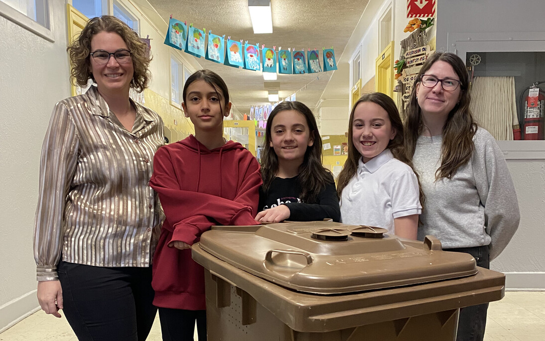 Photo du haut: On aperçoit Gabrielle Brisebois, mairesse de Montmagny, et Maude Côté, enseignante, en compagnie de Charlotte Maurice, Emy Carrier-Lamarre et Annabelle Guay, les trois étudiantes instigatrices de l'implantation de la collecte des matières organiques à l'école Saint-Pie X.