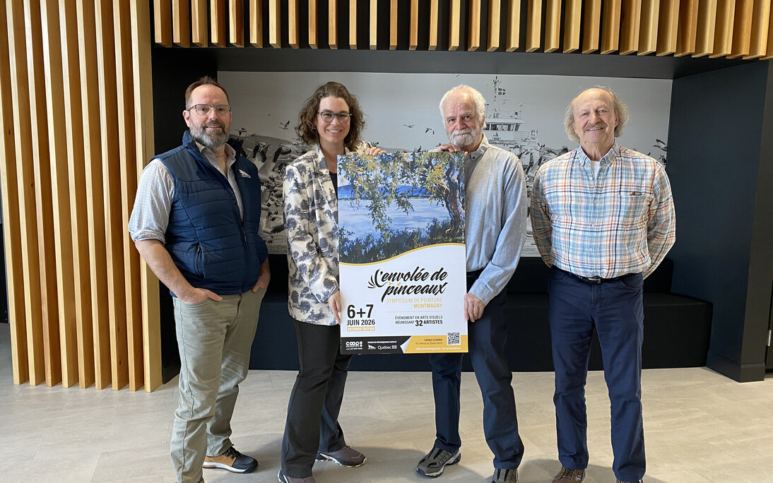 Photo (de gauche à droite) : Patrick Morency, coordonnateur culturel et touristique au Service des loisirs, de la culture et de la vie communautaire de la Ville de Montmagny, Gabrielle Brisebois, mairesse de Montmagny, Réal Fontaine, directeur artistique du symposium de peinture, et Michel Lemire, collaborateur de l'évènement.