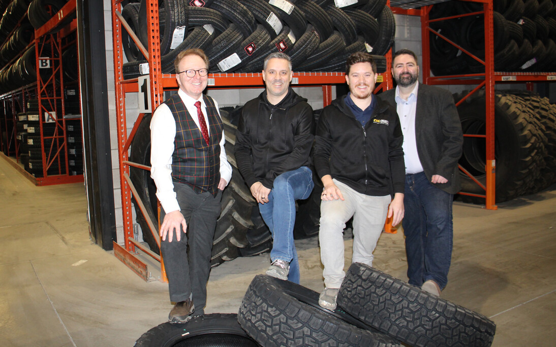 Sur la photo, on aperçoit les propriétaires d'OK Pneus André Ouellet, MM. Frédéric Ouellet et Marc-Antoine Leblond, entourés du maire de Montmagny et président de la SDÉ, M. Marc Laurin, et de l'agent de développement économique et de gestion d'évènements, M. Mathieu Sirois.