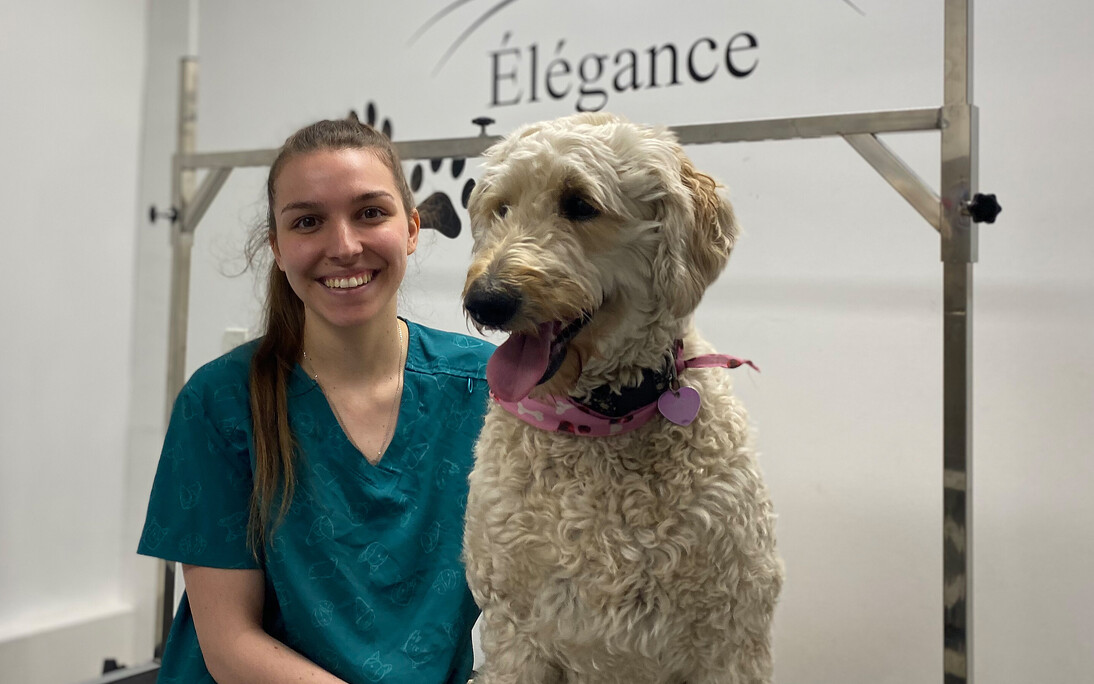 Mme Roy adore les animaux et ils le lui rendent bien, puisque leur présence réduit considérablement son stress et son anxiété. Trois chiens et deux chats partagent le quotidien de cette jeune entrepreneure! Mais au-delà de son affection pour eux et des bienfaits zoothérapeutiques qu'ils lui procurent, son choix de carrière s'est tranquillement confirmé dans le cadre de ses fonctions au sein de l'équipe d'Animalerie Montmagny. L'occasion d'occuper un espace dédié au toilettage lui a été proposée à la fin de 2022 et c'est à ce moment qu'elle a décidé de se lancer. Elle a depuis complété une formation en toilettage et terminé l'aménagement du local tout en poursuivant son emploi à l'animalerie. « Ce n'est pas toujours évident de trouver sa voie quand on est jeune, surtout quand on éprouve des difficultés à l'école. Mais il faut persévérer! J'ai la chance de pouvoir compter sur de précieuses personnes qui m'appuient et me guident dans mon parcours et aujourd'hui, je peux dire que je suis vraiment fière de moi », a exprimé Mme Roy.