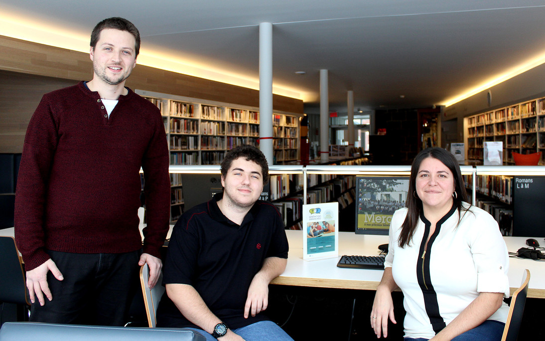 Photo : Le directeur adjoint de la Bibliothèque, M. Philippe Cadieux, en compagnie d'un des jeunes du programme Générations@branchées, Nicolas Émond, et de la présidente du Club Rotary de Montmagny, Mme Cynthia Lamontagne.